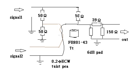 自作の信号源が120dBの出力が出て2つとも同じ出力、この2つをー6dBコンパイナーで合成して可変ATTで受信機に。