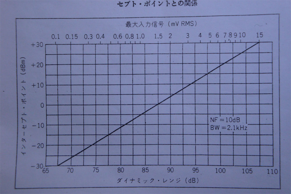受信機のダイナミックレンジの上限は3次の相互変調歪が受信機の雑音レベルと等しく成る入力信号レベルと定義