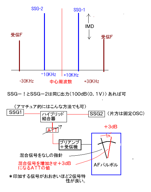 2つの信号を中心周波数より10Khzづつ離して合成、受信機はさらに30Khz離して受信。SSGの出力は120dBと最大