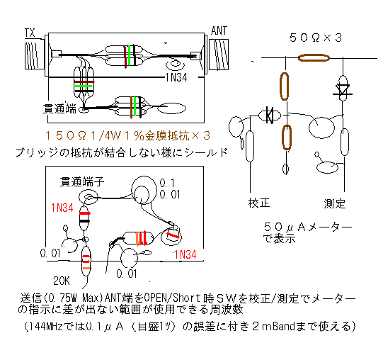 抵抗ブリッジで周波数特性は広帯域(1.9MHz〜144MHz)計測が可能、150Ω1wの抵抗