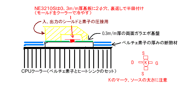冷やすとー3dB N.Fが下がるが、ペルチェ素子に電流を流すと?16℃下がる 12V3Aと大食いで山の移動用には向かない。