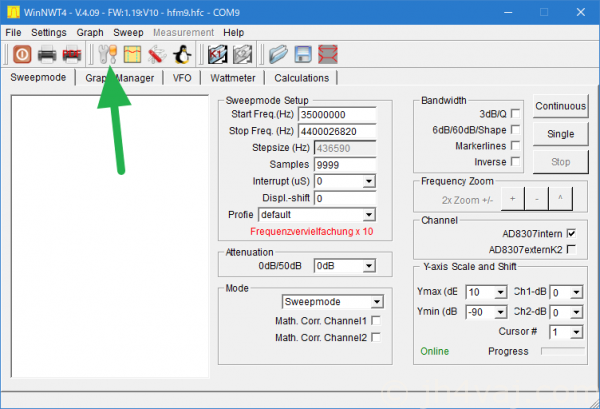 spectrumanrlyserのモードで無くSweepmodeにしないとスペアナにならないなぁんでか?やっとこ動作して、2日目は6000円を捨てるとこだったが何とか出来た
