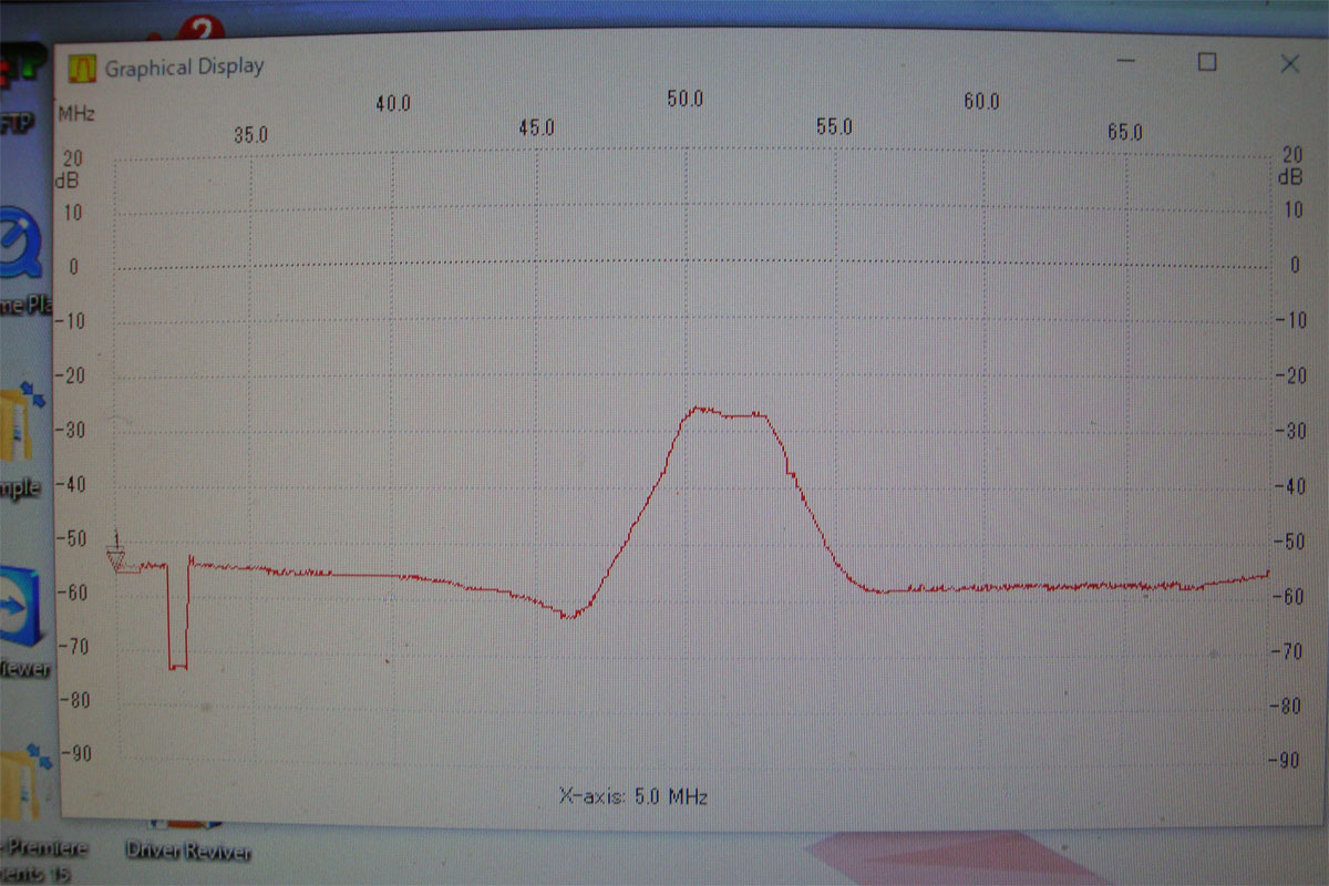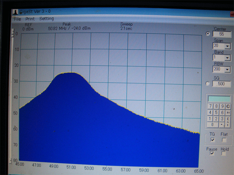 50MHzB.P.Fの特性曲線、通過帯域の損失が分からないのが残念だ、T/GをINに短絡して表示の値を覚えておかないといけない