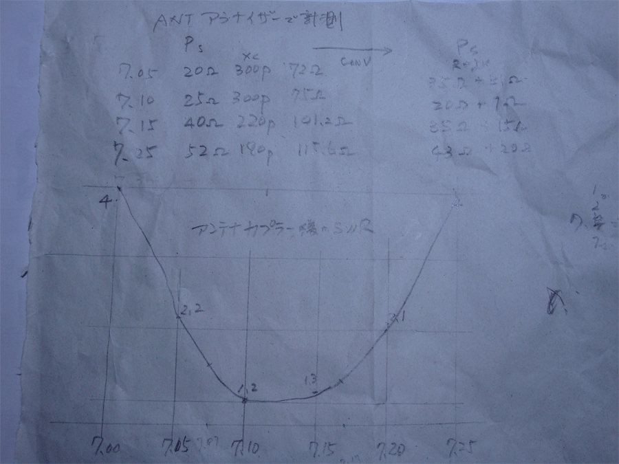 アンテナカプラーを入れてSWRを測る。まだ2の間が300無いので調整不足と文中に、