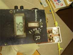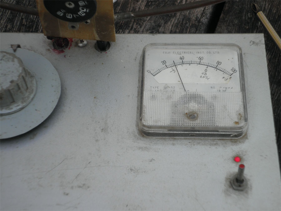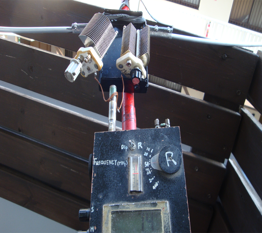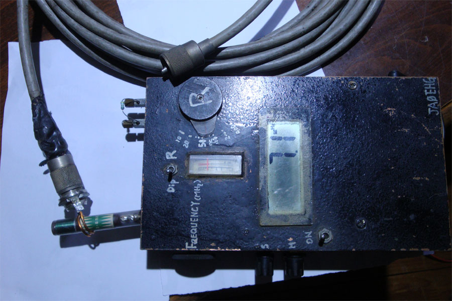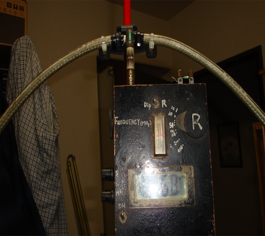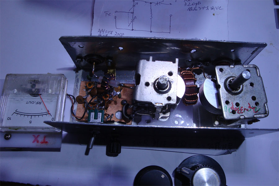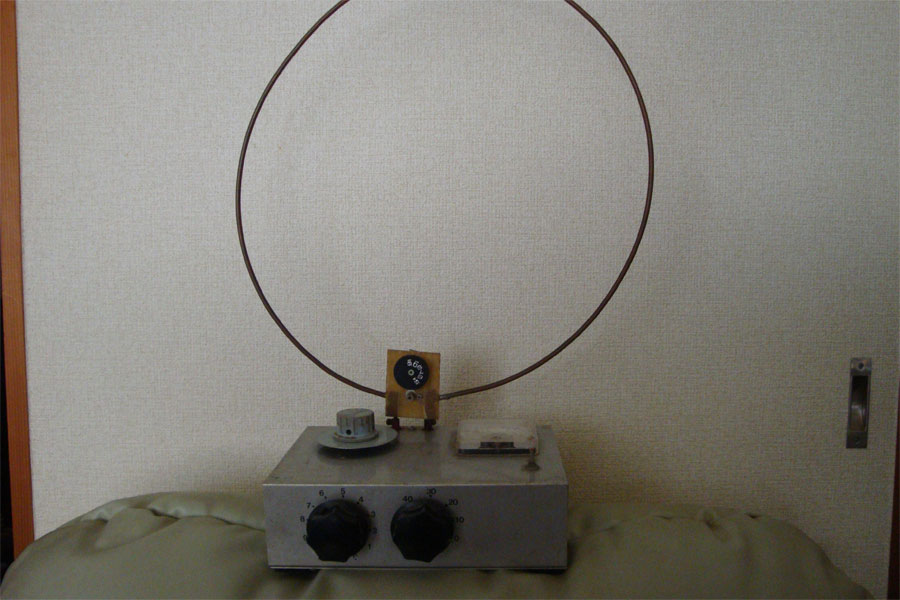 電界強度計の振れを見る同調回路は外して15cm位の銅線を立てる。1wで送信、タップを決める。