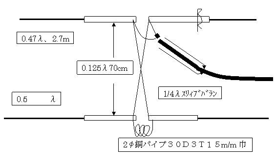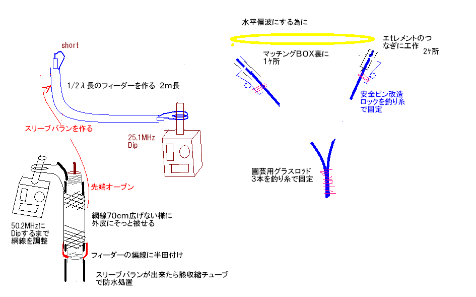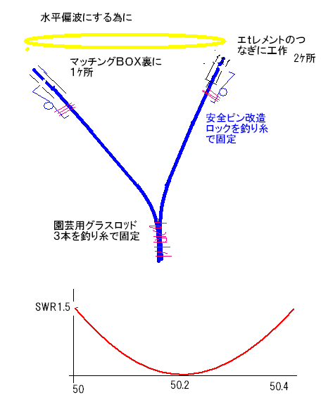 L,Cの共振だ、ポールは金蔵棒にする必要が有るがビニール線を垂らして代用にする。フィーダーの