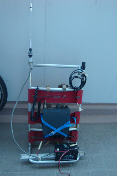 アルミ製の背負子にM座をステンレスバンドで留めてアンテナの差し替えが出来る様に