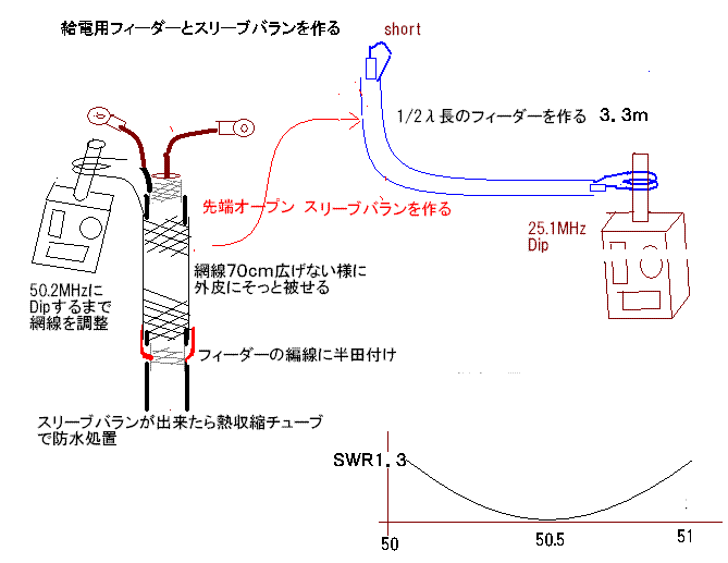 λ/2の同軸フィダーでアンテナから下ろしてくるとアンテナの状態が手元に来る事を利用する。
