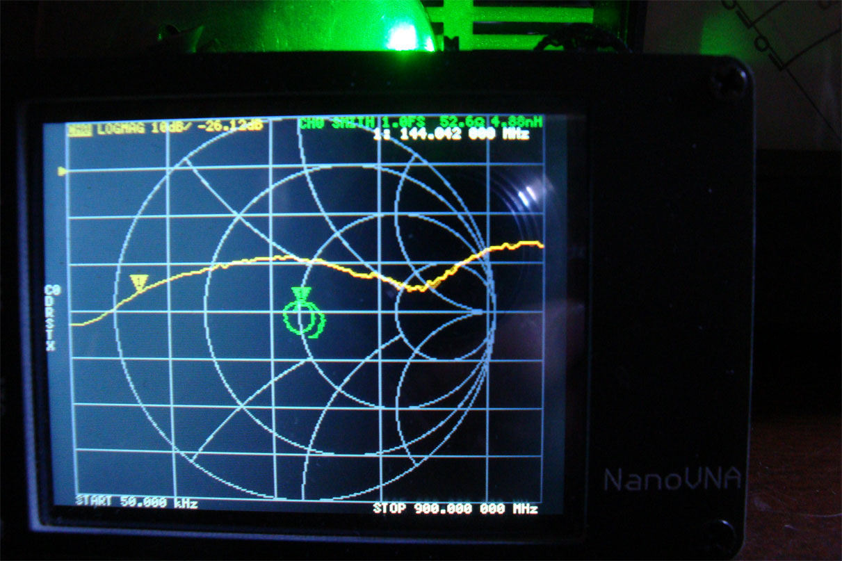 50Ω1G250wターミネーション。テスター計測で48Ω。+XLが表れる。マーカーは144MHz、それより高い周波数ではXLが表れる。400MHz