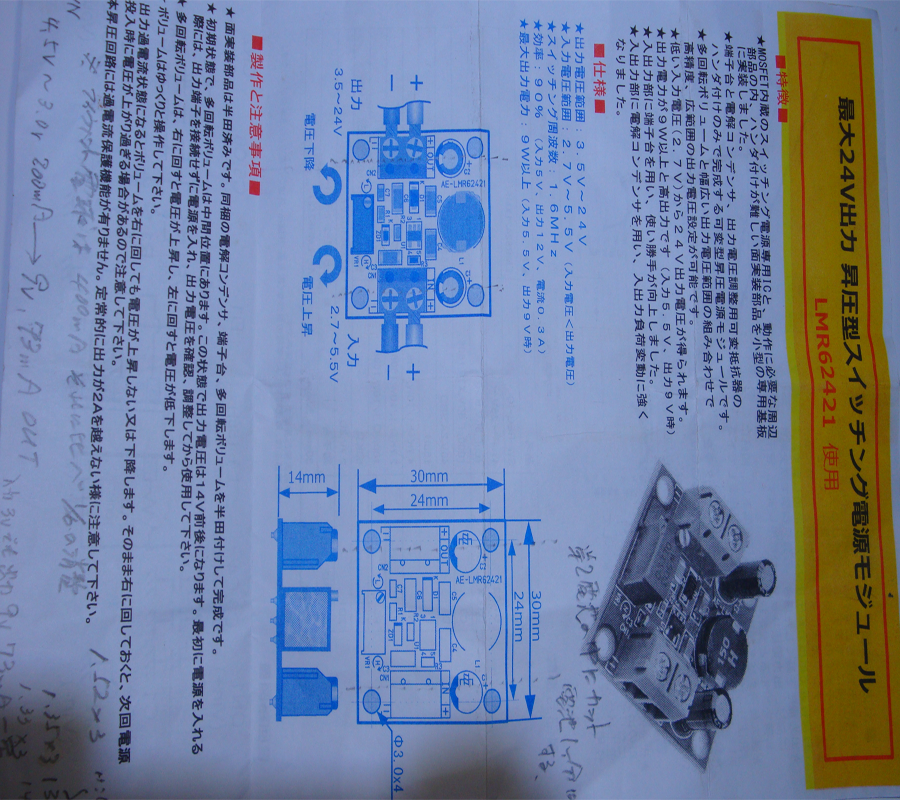 4.5v-200mAを9v-73mAに昇圧、電池が3vに低下しても出力は同じ、