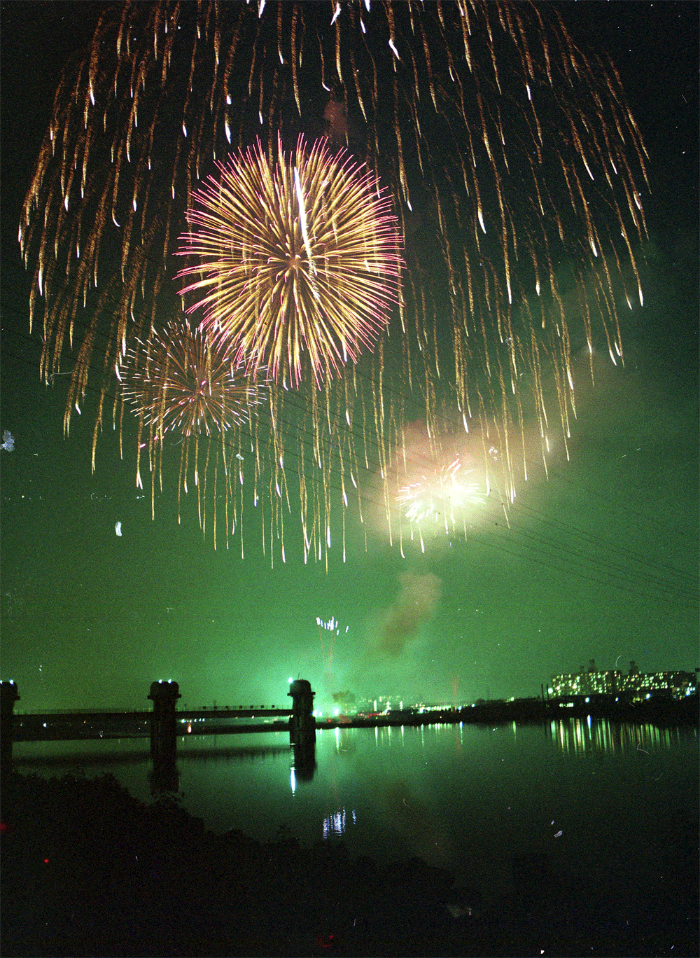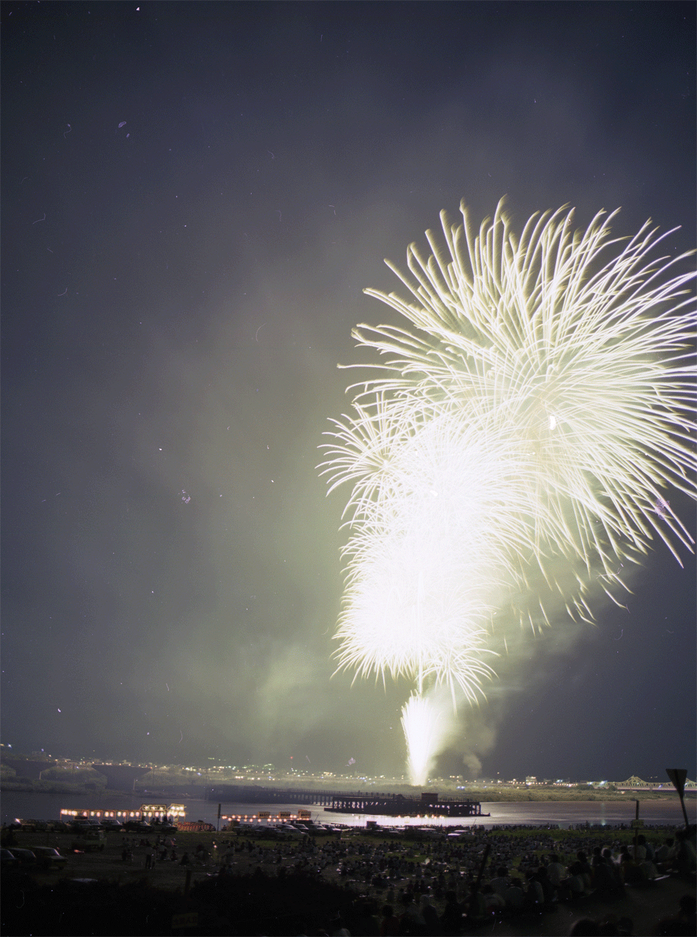 花火の上まで入る距離を頭に入れて、暗くなる前に河原に陣取る、くらいの情熱がいるでしょう。絞りは1/125くらいで<B>、