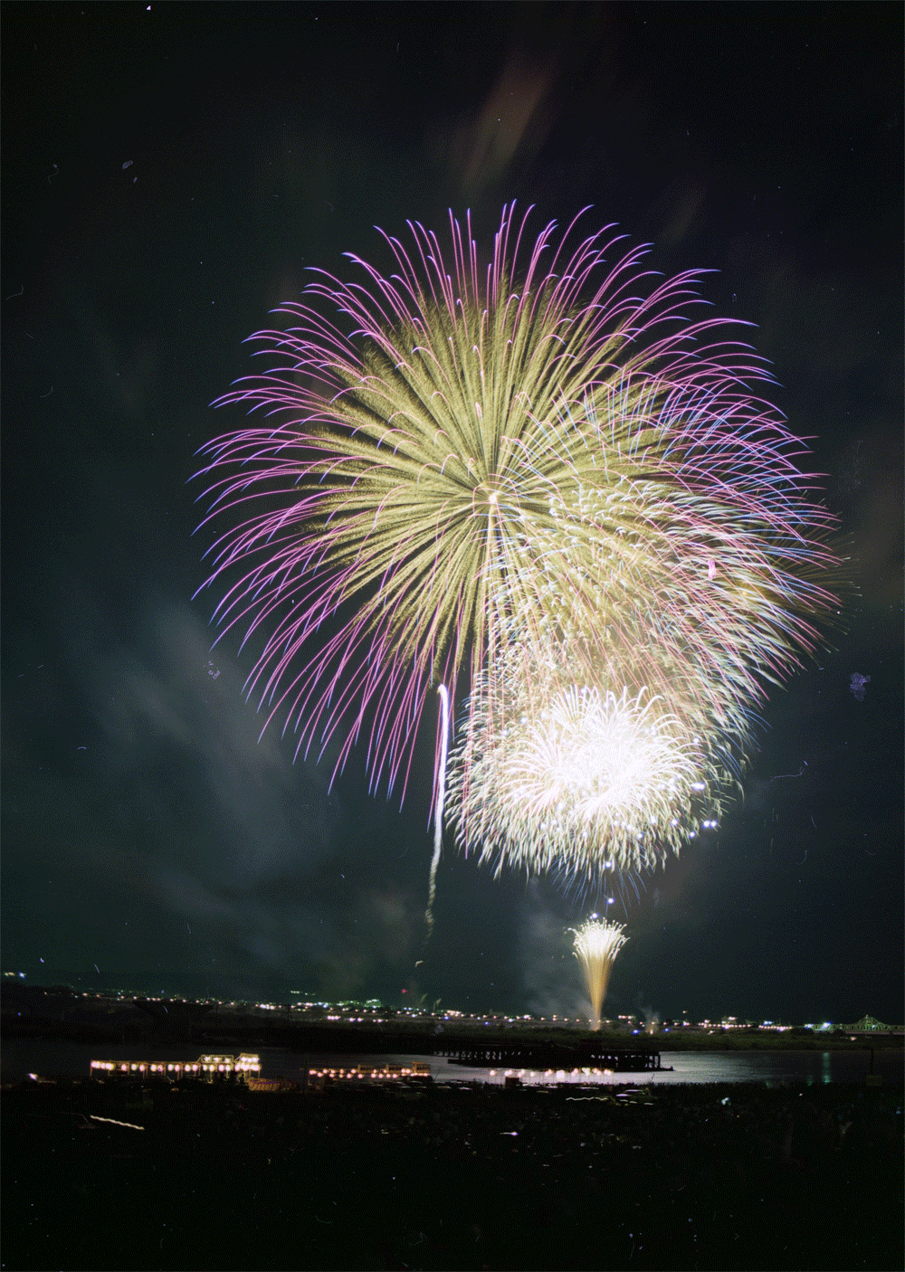 長岡の花火、三尺球が有名30cm×3尺で90cmの球が約600m打ち上げられるそうな、およそ20kgほどの火薬の詰まった紙の玉を20kg程の火薬で打ち上げる。打ち上げの筒は2m。結構低音な打ち上げ音でまだかまだかと高く上がるのでのけ反って仕舞うほど見上げながら待ってやっと大音響とともにこれまたでかいデカイ花火が開きます。