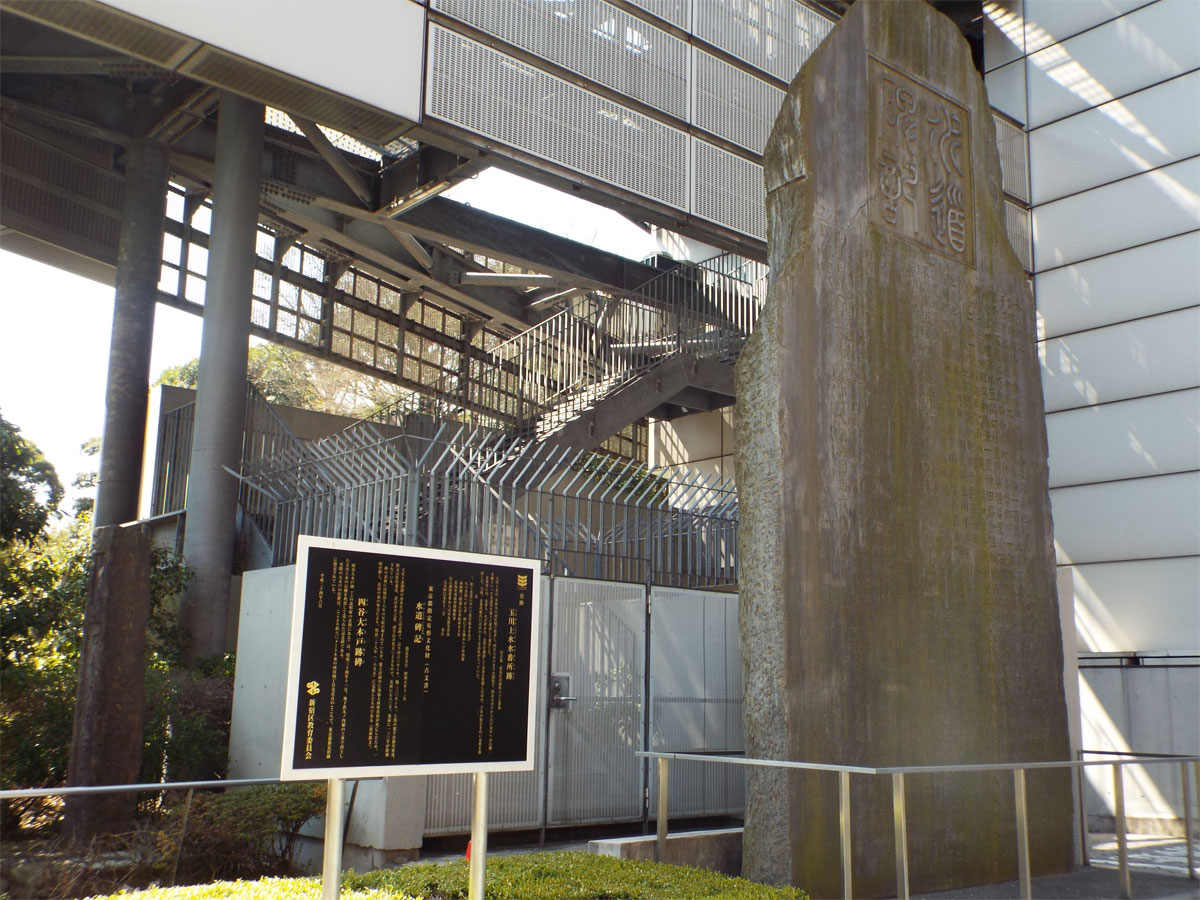 御苑の大木戸口の角の建物は水道局、道路側の東角に水道碑記の大きな石碑、裏に大木戸門に石碑、こんなところに有ったとは