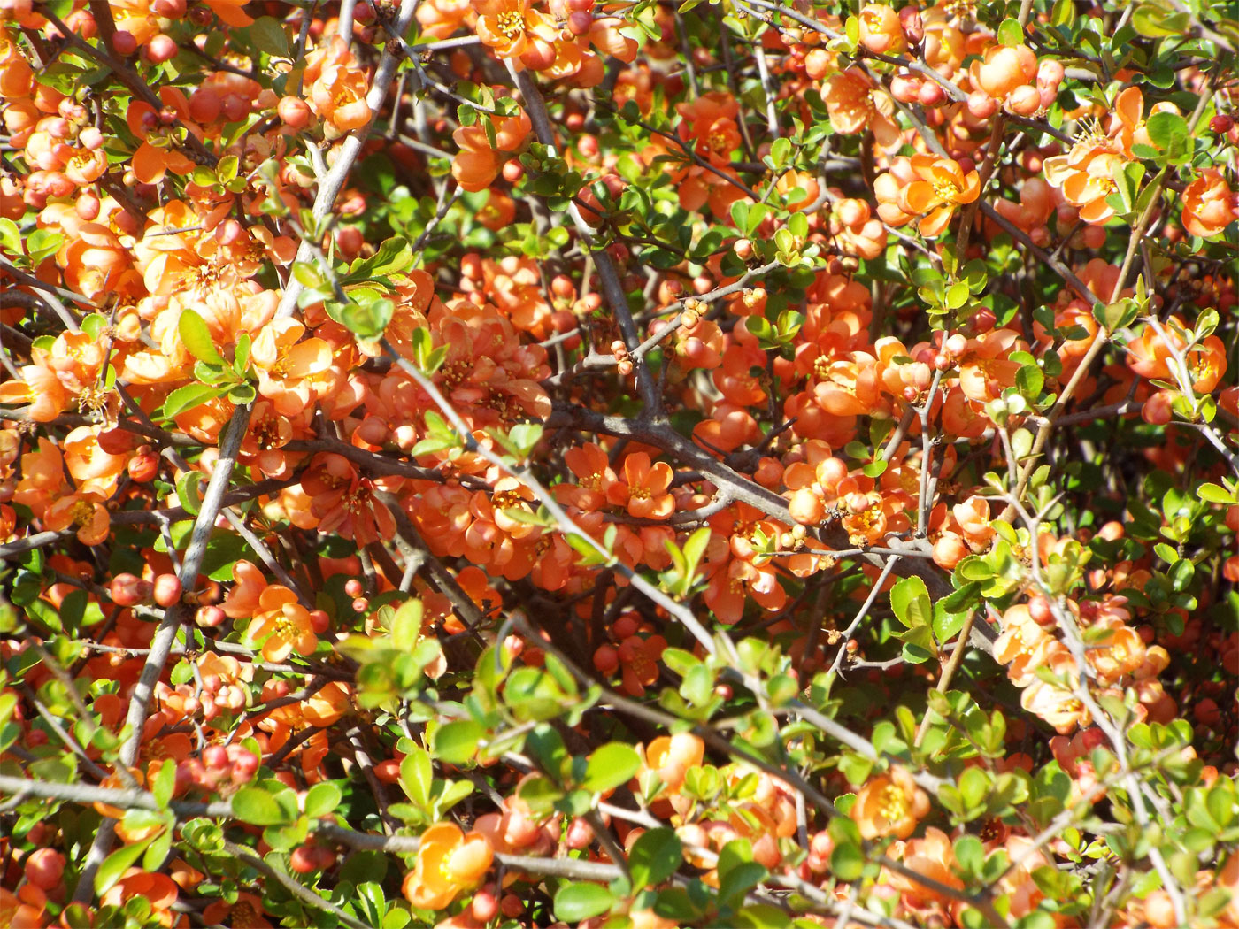 日本庭園の池の周りの散策路のぼけの花,庭園の低いところに池、周りは小高い丘、小川のせせらぎが有ったらもっと日本庭園に成るのに勿体無い、
