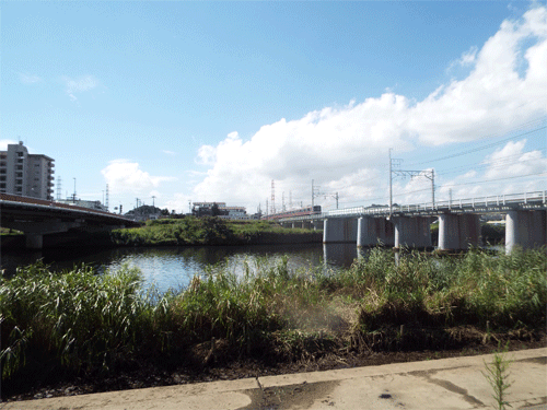 上末吉あたりの下水処理場の橋の下の日陰で、帰りは恩田川から。