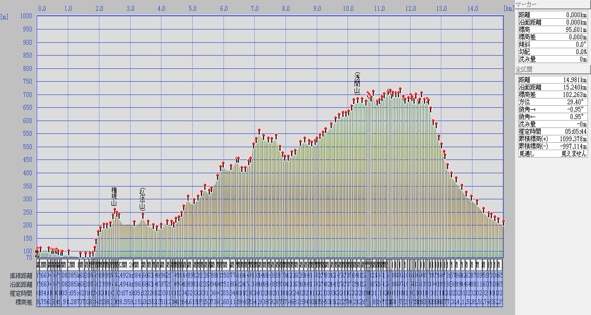 高くても700mしかない低山のハイキング。登ったり下ったりはそこそこ有る。