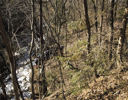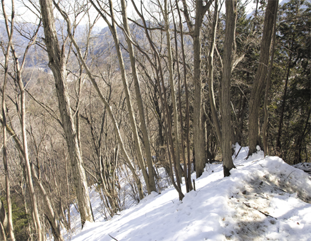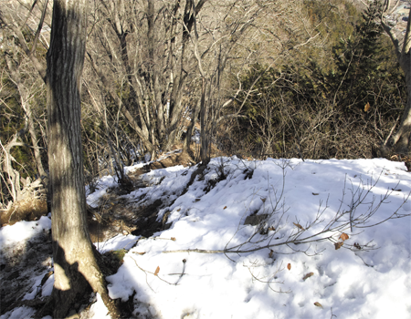 リニア実験線の真上、一気に400m下るが残雪が凍っているので軽アイゼンが効いて楽しい雪山