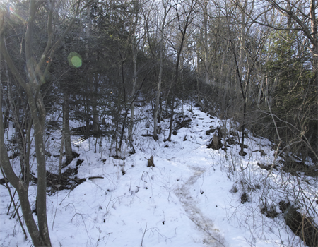 これから標高を400mちかく登る急登、快晴4℃風が無ければ快適、軽アイゼンでなかなか良いぞ