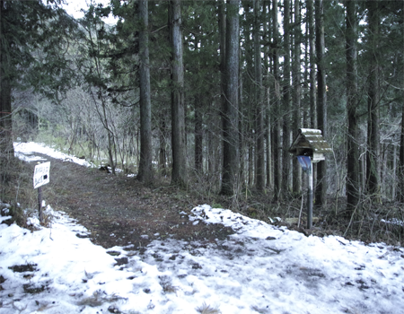 林道の終点に登山者のカウンター。更に登ると男坂、女坂の分岐。