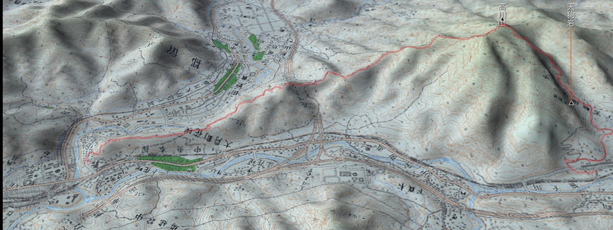 初狩駅から高川山を登ってむすび山に至る行程を赤線で表示。8.2Km、607m登って701m下る、5時間15分