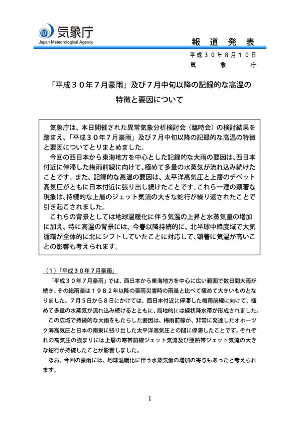 平成最後の夏の酷暑と大雨を気象庁が分析している。